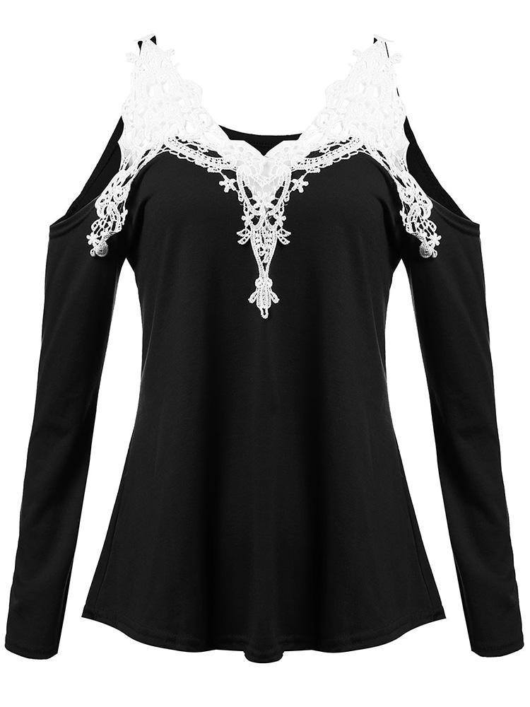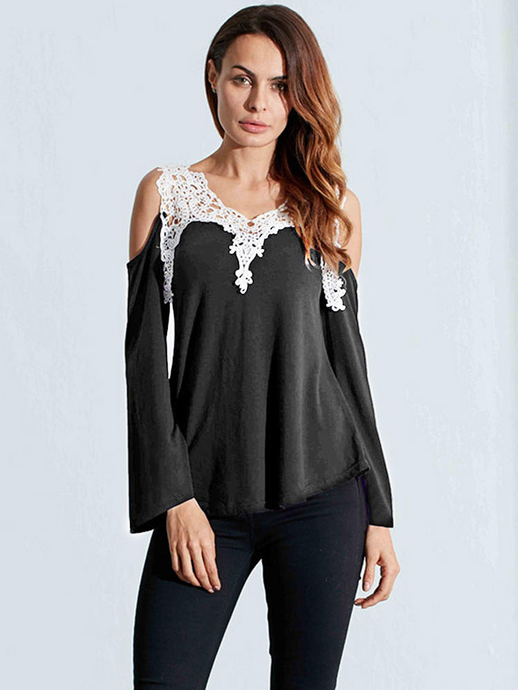 • Sexy Women Lace Patchwork Hollow Crochet Off Shoulder Solid T-Shirt