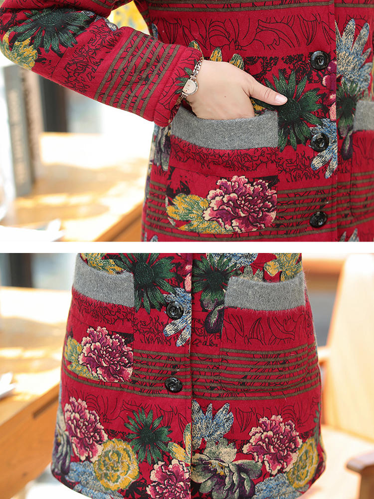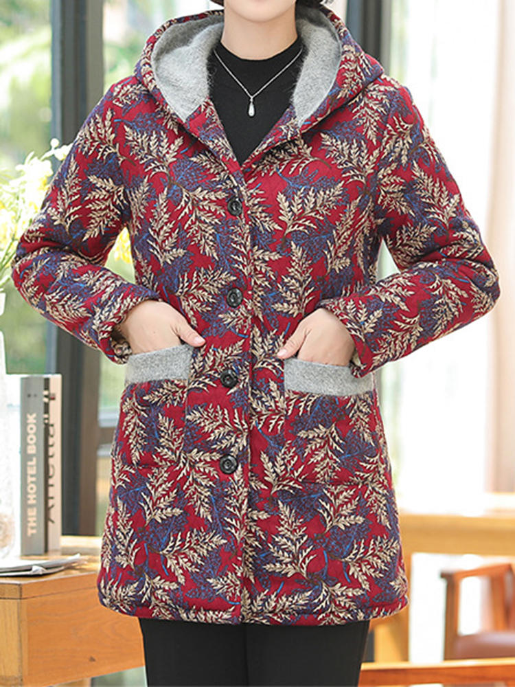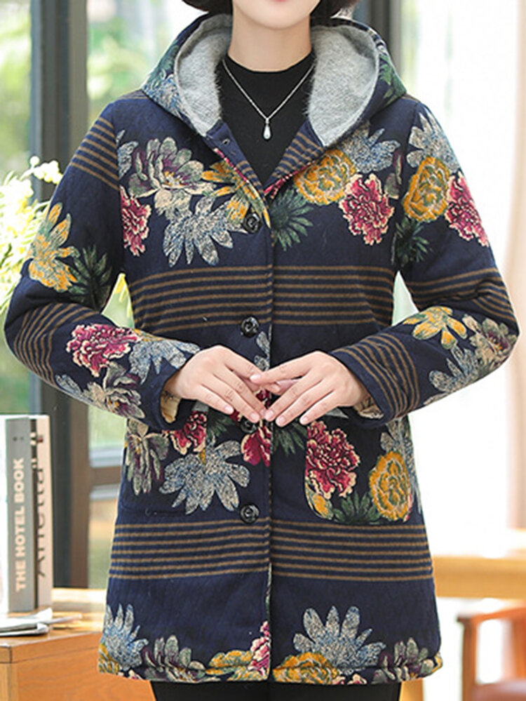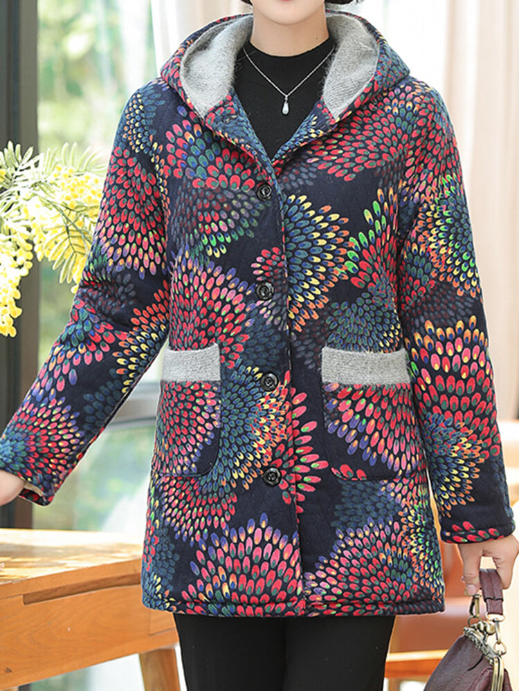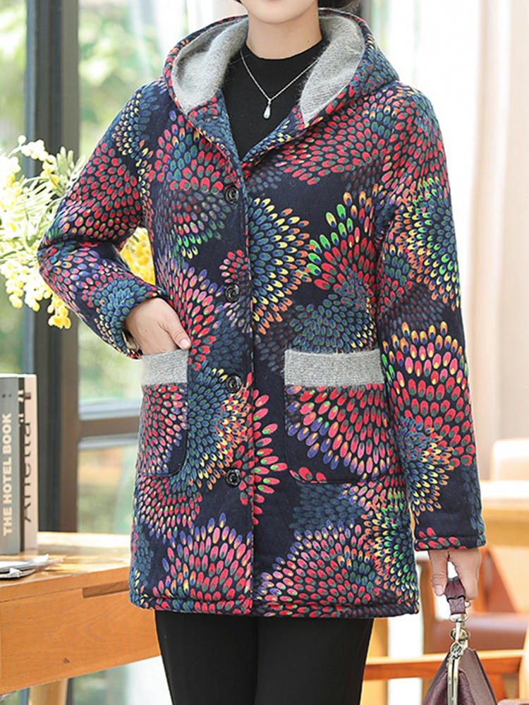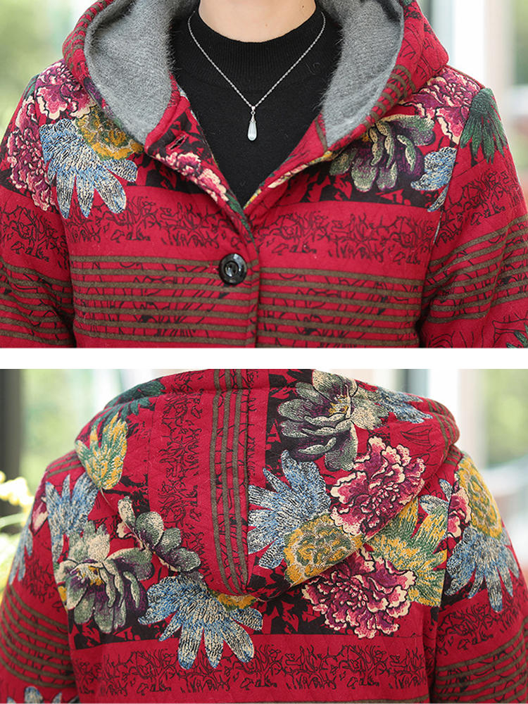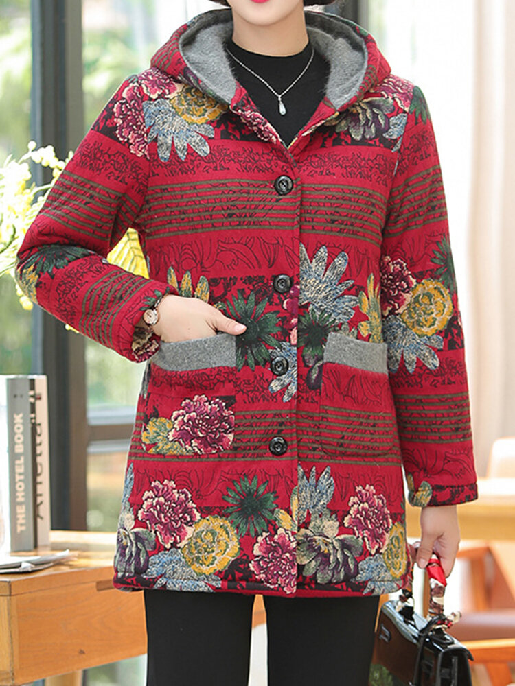 • Vintage Women Floral Print Patchwork Button Long Sleeve Hooded Coats