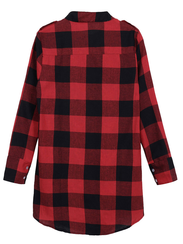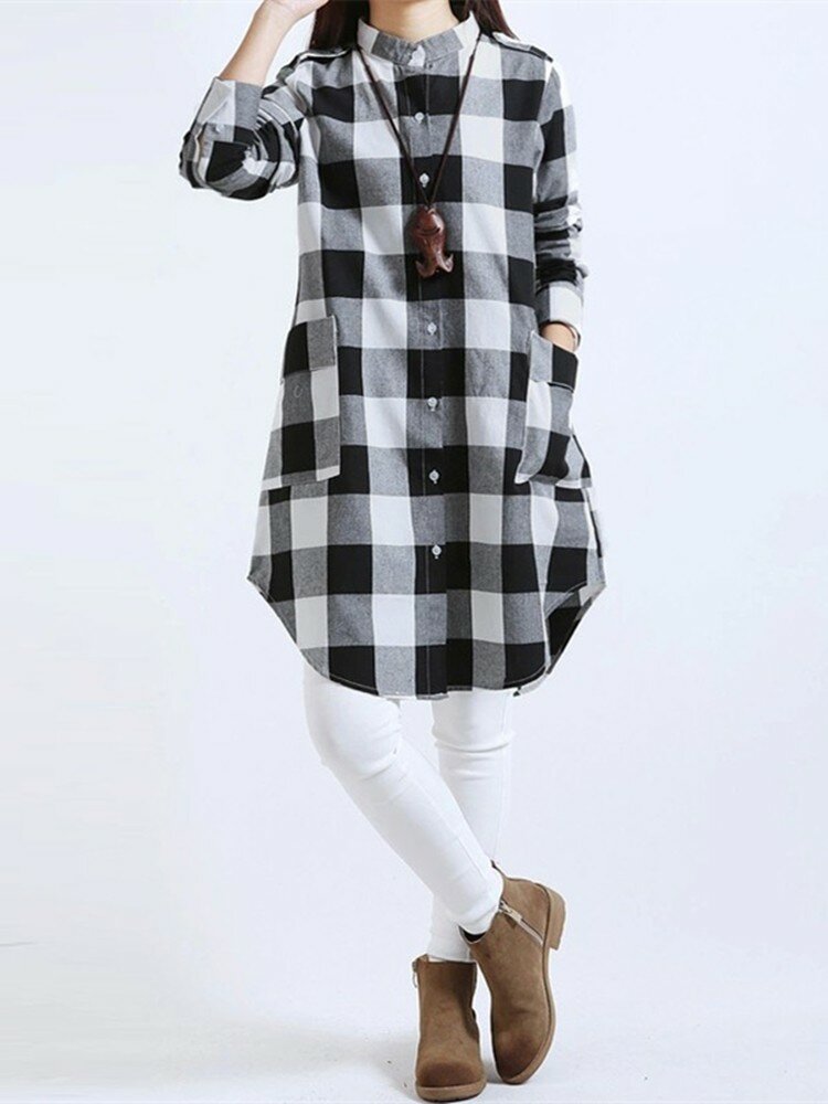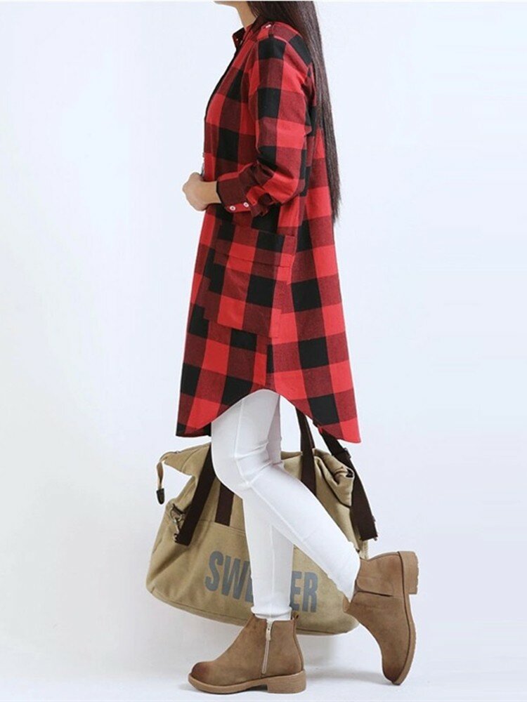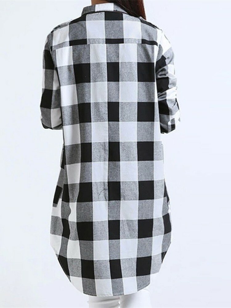 Women Casual Long Sleeve Plaid Loose Pocket Button Long Blouses COD