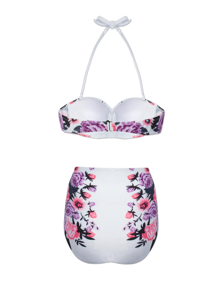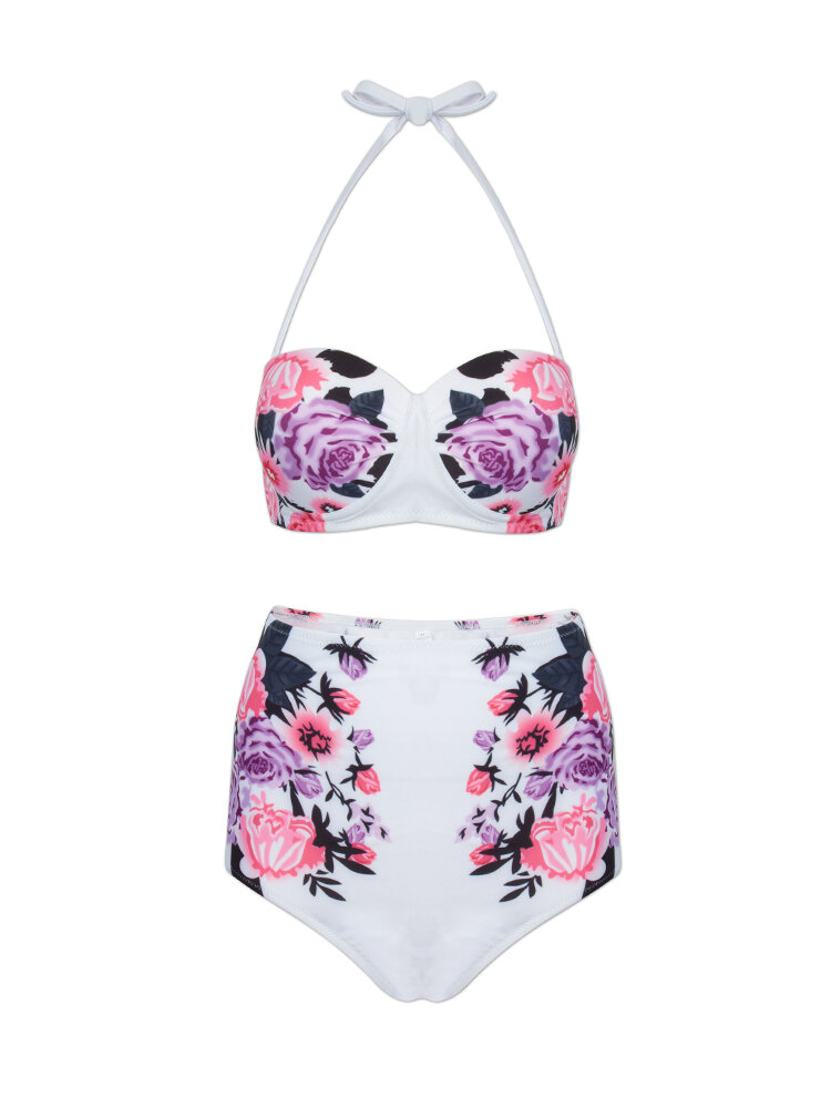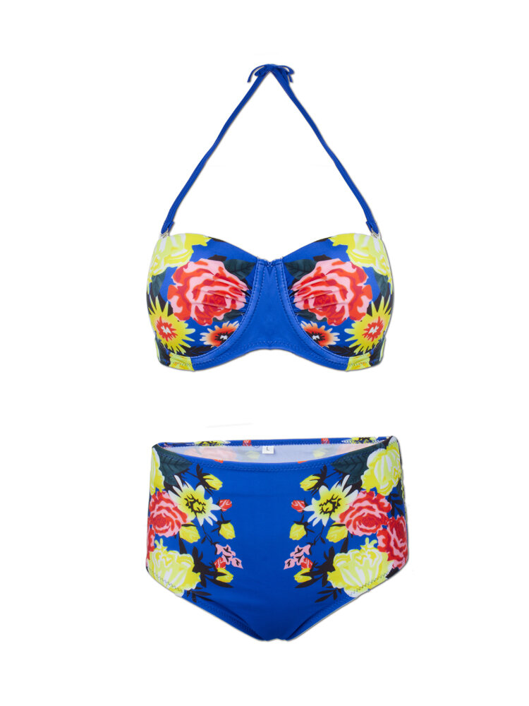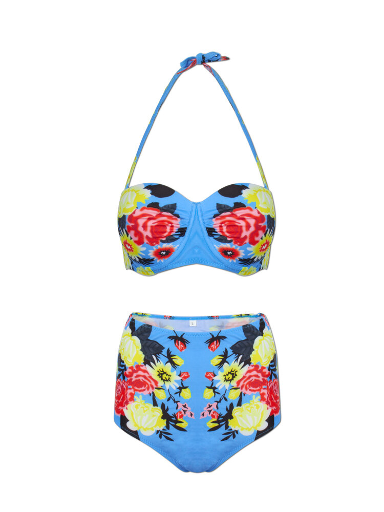 Women Sexy Spaghetti Halter Strap Floral Printed High-Waisted Push Up Bra Bikini Set