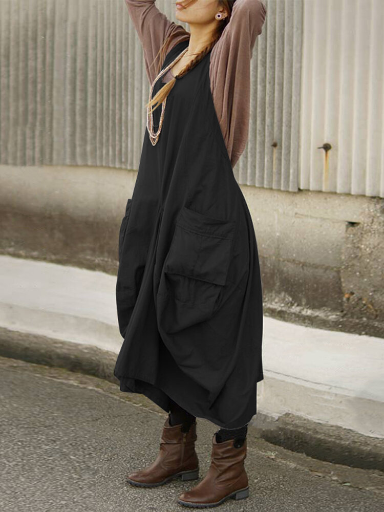 Women Vintage Sleeveless V Neck Straps Back Cross Solid Apron Dress